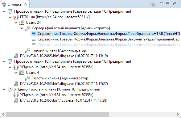 Внутри каждого сеанса 1C:EDT показывает его предметы отладки. Например, в одном сеансе это могут быть тонкий клиент и сервер, а в другом — толстый клиент.