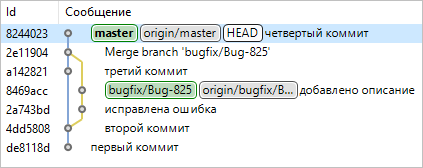 Стандартно панель История показывает коммиты той ветки, которую вы просматриваете, а также коммиты, выполненные в тех ветках, которые влиты в просматриваемую ветку. В результате вы видите схему веток, которая может быть довольно разветвленной.