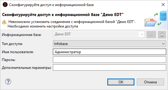 - В окне Сконфигурируйте доступ к информационной базе укажите настройки доступа, которыми будет пользоваться 1C:EDT при взаимодействии с этой базой: