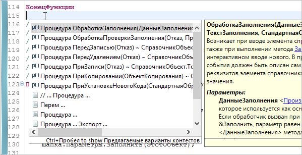 Такая подсказка работает не только для типов, определенных в платформе, но и для ваших собственных процедур и функций, если комментарий к ним составлен по правилам. Такие комментарии проще всего создавать командой Источник Генерировать комментарии к методу контекстного меню в редакторе встроенного языка.