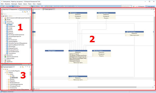 Поэтому исторически в конфигураторе «1С:Предприятия» используется другая концептуальная модель, представляющая базу данных в виде дерева объектов конфигурации. Объекты конфигурации скрывают за собой реляционную модель, они сгруппированы по принадлежности к тому или иному классу прикладных задач. Такое представление удобно для быстрого нахождения нужных объектов, изменения их свойств и т. д. Однако это представление не дает простого и наглядного понятия о взаимной связи разных объектов между собой.