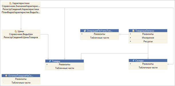 Допустим, вам нужно разобраться с устройством незнакомого механизма или подсистемы. Например, нужно понять, как устроена подсистема ТоварныеЗапасы: какие объекты в ней задействованы и как они связаны друг с другом.