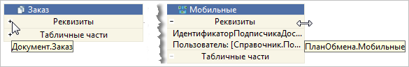 Чтобы лучше видеть, в каких реквизитах объекта задействованы связи, дважды кликните на строке Реквизиты и она раскроется. Аналогичным образом можно раскрывать другие реквизиты (табличные части, измерения, ресурсы), а также сворачивать раскрытые группы обратно.