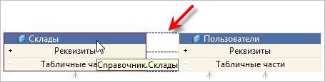 У объекта может быть много связей. Чтобы легче ориентироваться в них, можно кликнуть на заголовок исследуемого объекта, и тогда исходящие из него связи будут подсвечены. Также будут подсвечены и реквизиты объекта, задействованные в этих связях.