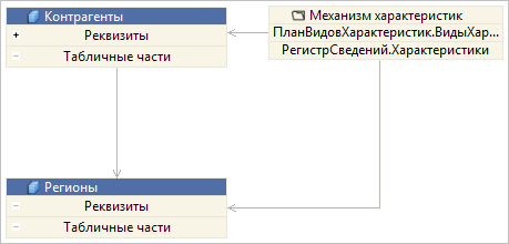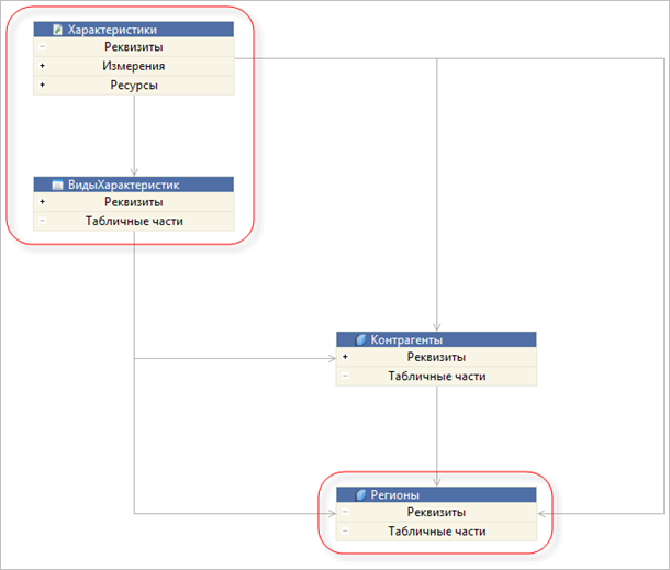 В результате схема примет более простой вид, из которого будет понятно, что справочник Регионы используется только справочником Контрагенты. Но кроме этого, как и подавляющее большинство объектов этого приложения, он задействован в механизме характеристик. Подробности этого механизма в данном случае неважны.