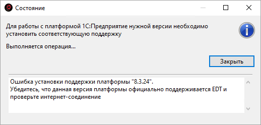 Это не ошибка. Для того, чтобы дистрибутив 1C:EDT не был очень большим, он содержит поддержку только нескольких последних версий платформы «1С:Предприятие». Если в процессе работы требуется поддержка отсутствующих версий, 1C:EDT может автоматически скачать и доустановить нужные файлы. Это и пытается сделать 1C:EDT в данном случае.