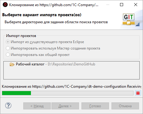 В этом примере демонстрируется подключение к публичному репозиторию фирмы «1С» на GitHub и