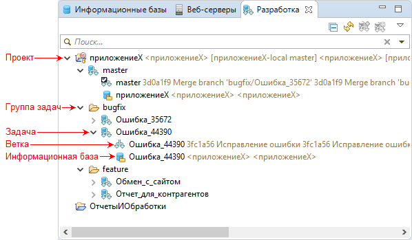 , связанные с этими ветками. Если с веткой Git не связана никакая информационная база, то такая ветка и соответствующая ей задача не отображаются в панели.