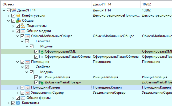 Этот режим позволяет вам анализировать отличия в разрезе отдельных методов модуля. При сравнении конфигураций методы отображаются в общей структуре конфигурации. Можно видеть, например, добавленные методы, можете исключить из объединения любой из методов.