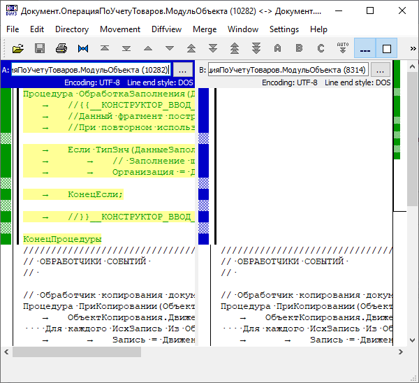 Он учитывает семантику встроенного языка и может определять перемещение фрагментов кода (процедур и функций) внутри модуля. В результате вы не просто видите, что строки одного модуля отличаются от строк другого, а понимаете, что в принципе модуль не изменился, изменилось лишь положение процедур внутри него.