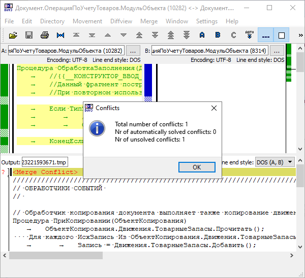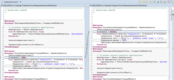 Редактор сравнения и объединения текстовых файлов можно использовать, например, для сравнения двух общих модулей. Также мы интегрировали его в редактор сравнения и объединения конфигураций, поэтому при сравнении модулей будет также использоваться этот редактор.