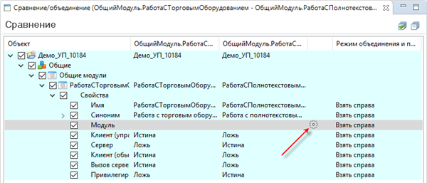 Этот редактор вызывается для сравнения и объединения модулей, которые присутствуют в редакторе сравнения и объединения конфигураций. Чтобы открыть этот редактор, нажмите "шестеренку" в строке Модуль.