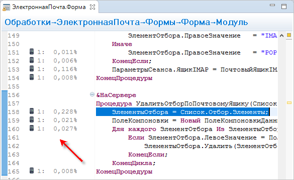 Дважды кликнув на строке замера вы откроете модуль, который содержит эту строку. В редакторе встроенного языка будет выделена исполнявшаяся инструкция.