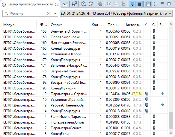 По окончании замера 1C:EDT автоматически откроет панель Замер производительности, содержащую результаты замера.