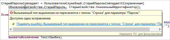 Пока не включена строгая типизация, 1C:EDT не проверяет соответствие указанных и используемых типов. После включения строгой типизации 1C:EDT будет сообщать обо всех подобных ошибках. Например, если вы указали, что у параметра тип Строка и передали в него значение типа Число.