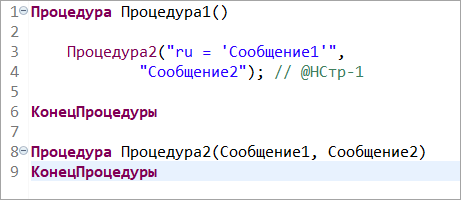 Если этот флажок установлен, то считается, что комментарий относится ко всему выражению целиком, а не только к конкретной строке со строковым литералом и аннотацией. В следующем примере аннотация @НСтр-1 относится к литералу "ru = 'Сообщение1'", если установлен этот флажок. Иначе аннотация @НСтр-1 относится к литералу "Сообщение2".