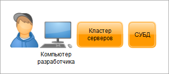 Пользователь запускает толстого клиента. На компьютере пользователя исполняется код на встроенном языке в контексте клиента. На компьютере кластера серверов исполняется код в контексте сервера.