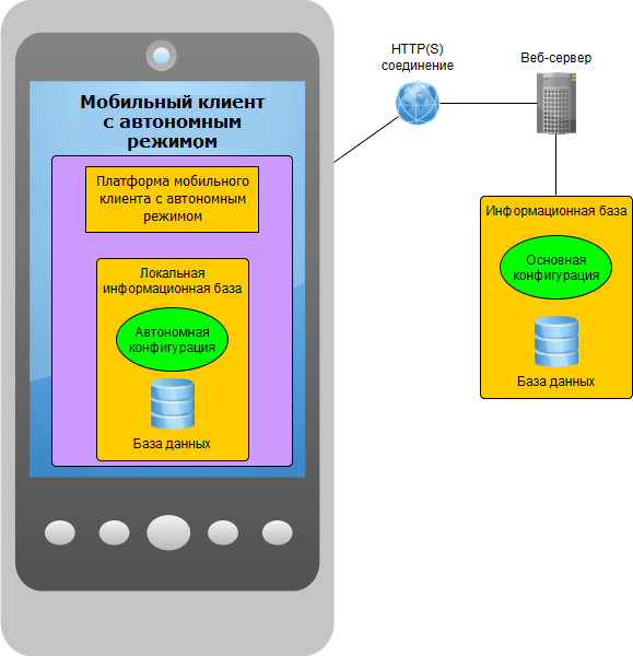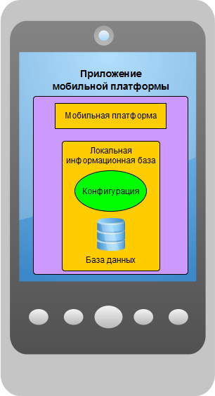 Если проводить аналогию с настольной версией «1С:Предприятия», то приложение мобильной платформы является аналогом тонкого клиента, работающего с файловой информационной базой, которая находится на том же компьютере, что и тонкий клиент.