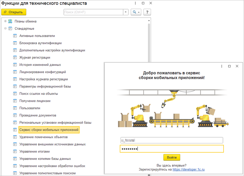Для работы с сервисом запустите любую (можно даже и пустую) информационную базу в режиме «1С:Предприятие», вызовите из системного меню Функции для технического специалиста и запустите стандартную обработку Сервис сборки мобильных приложений. Затем авторизуйтесь (или зарегистрируйтесь, если у вас еще нет учетной записи) на сайте developer.1c.ru в сервисе.