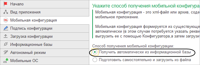 На странице Мобильная конфигурация выберите способ получения мобильной конфигурации — Получить автоматически из информационной базы.