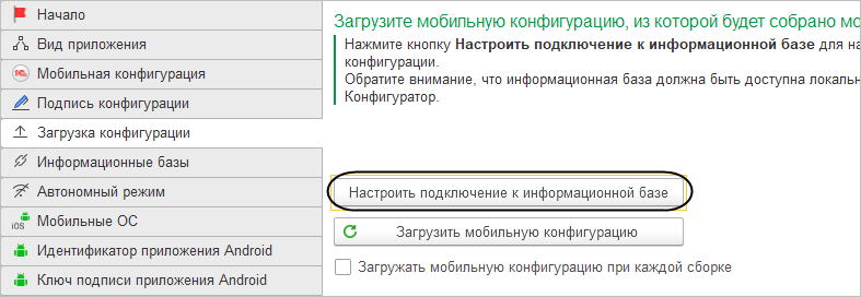 На странице Загрузка конфигурации загрузите мобильную конфигурацию, из которой будет собрано мобильное приложение, нажав кнопку Настроить подключение к информационной базе.