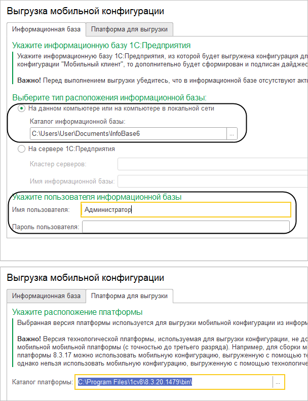 В открывшемся диалоге на закладке Информационная база укажите, где находится база с вашей конфигурацией, а также имя и пароль (в данном примере его нет) пользователя информационной базы — Администратор. На закладке Платформа для выгрузки каталог платформы оставьте без изменений, если вы его не меняли при установке.