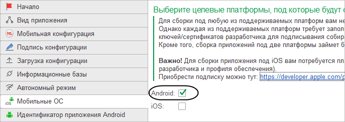 На странице Мобильные ОС укажите, что вы хотите собрать мобильное приложение для платформы Android.