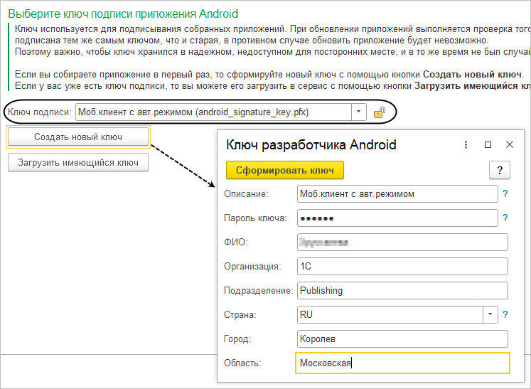 На странице Ключ подписи приложения Android нужно задать ключ подписи, которым будут в дальнейшем подписываться все версии этого приложения. Поскольку вы собираете приложение в первый раз, создайте новый ключ (запомните его пароль), и при установке новых версий приложения оно будет обновляться. Нажмите кнопку Создать новый ключ. Заполните все необходимые поля и нажмите Сформировать ключ. Созданный вами ключ отобразится в поле Ключ подписи.