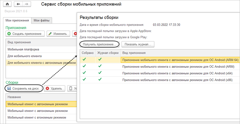 Чтобы сохранить установочные файлы на компьютер, с которого выполнялась сборка, нажмите Сохранить на диск, выберите архитектуру процессора мобильного устройства (ARM-64, ARM и т. п.) и нажмите Получить приложение.