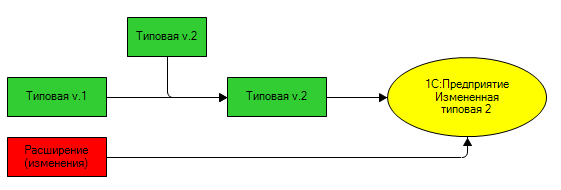 После этого, в режиме «1С:Предприятие», расширение просто подключается к типовой конфигурации. Платформа автоматически объединяет расширение с типовой конфигурацией. В результате заказчик работает с измененным, по его желаниям, типовым решением.
