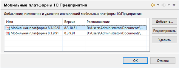 Сначала нужно добавить на компьютер мобильную версию платформы «1С:Предприятие» и указать 1C:EDT где она находится.