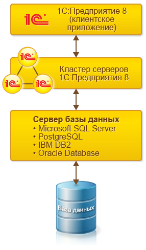 В этом варианте база хранится в одной из поддерживаемых систем управления базами данных, а взаимодействие между клиентским приложением и СУБД осуществляет кластер серверов «1С:Предприятия».