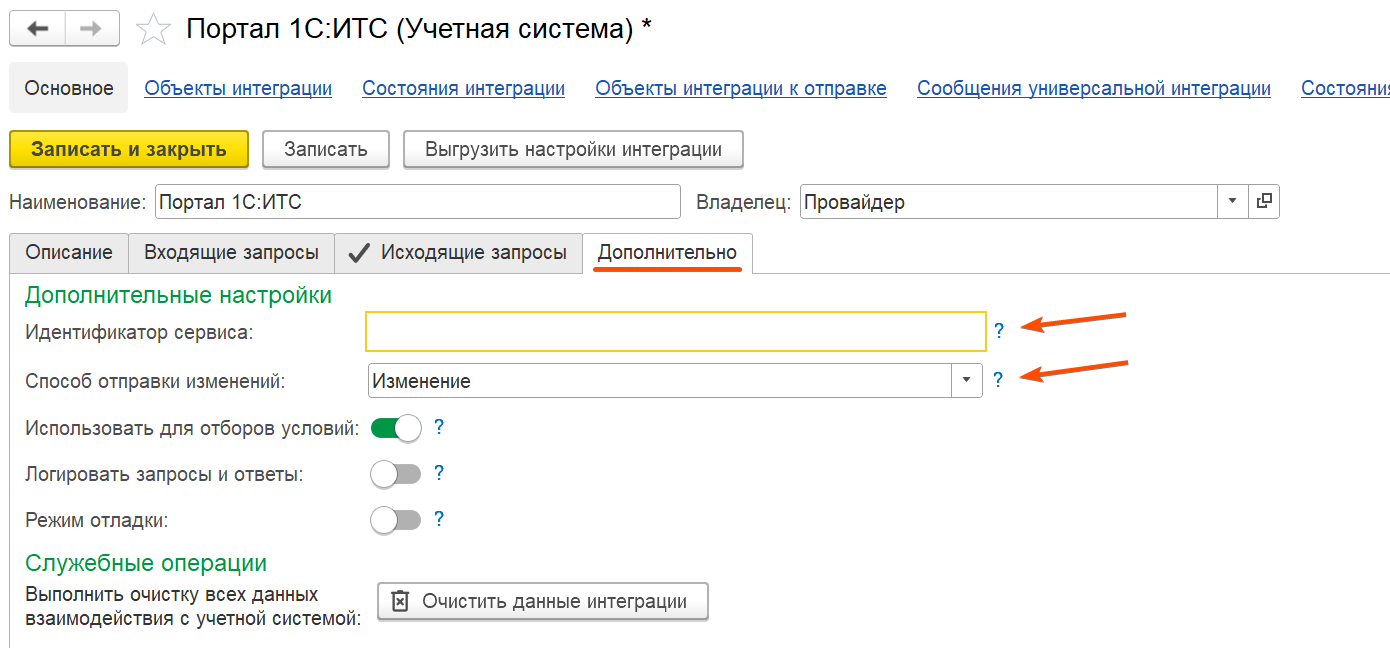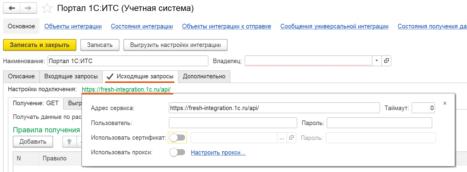| 7 | Заполняем полученные от портала настройки в элемент справочника Учетные системы Портал 1С:ИТС (раздел Интеграция) На вкладке Исходящие запросы: