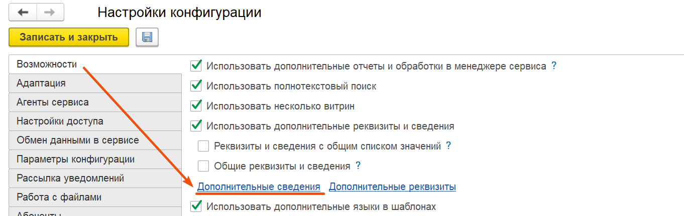 Если они не созданы, их нужно создать: Главное → Настройки конфигурации → Дополнительные сведения Далее для абонента создать строковые дополнительные сведения: Убедиться что имена для разработчиков соответствуют указанным. | |||||||||
