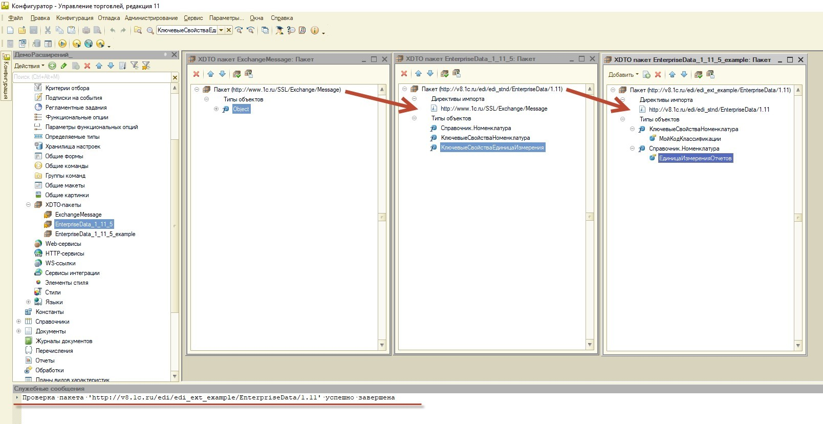 Необходимо обратить внимание на директиву импорта, т.к. это ключевой момент. Обязательно нужно указать, что наш пакет-XDTO унаследован от типового. Это необходимо для того, чтобы сослаться на базовые объекты формата и, в дальнейшем, оперировать их свойствами. Поскольку пакет EnterpriseData_1_11_5 базируется на ExchangeMessage, так же необходимо забрать и его в расширение, иначе анализатор платформы выдаст ошибку проверки пакета. При этом XDTO-пакет EnterpriseData_1_11_5 нужно забрать со следующими объектами: