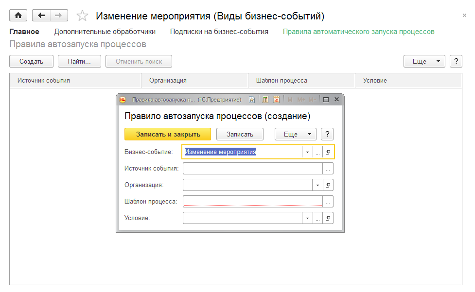 Ответственный за шаблоны процессов сотрудник настраивает старт процессов по событиям в форме ФормаЗаписи регистра НастройкаШаблоновБизнесПроцессов или ПравилаАвтоматическогоЗапускаБизнесПроцессов. Настройки в обоих случаях сохраняются в регистр сведений ПравилаАвтоматическогоЗапускаБизнесПроцессов. За сохранение отвечают процедуры СохранитьПравилоАвтоматическогоЗапускаБизнесПроцессов и ПолучитьБизнесСобытияПоВидуДокумента общего модуля БизнесСобытияВызовСервера.