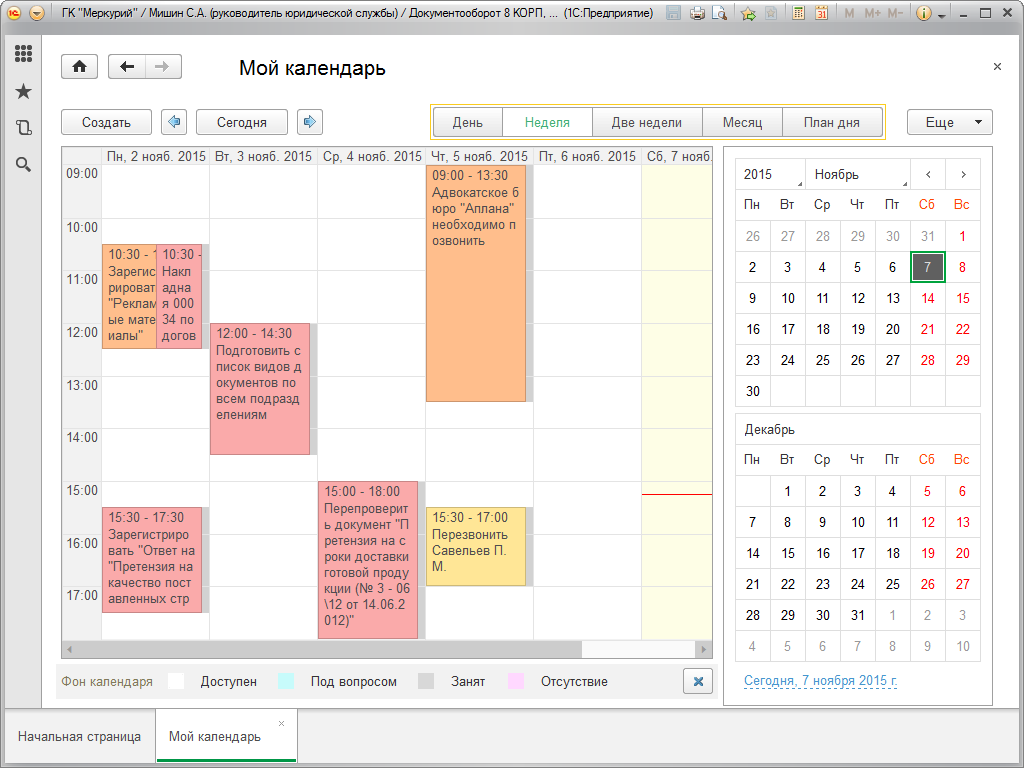 Календарь в "1С:Документообороте" предназначен для планирования времени пользователей. В календаре отображается информация о записях календаря, мероприятиях, отсутствиях, занятом и свободном времени. Основной способ использования календаря – через команду Мой календарь. Для просмотра календарей других пользователей используется команда Все календари в разделе Совместная работа.