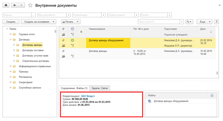 Практически все реквизиты, представленные в превью, являются ссылками, причем клик на разные данные порождает различные действия. Например, клик по электронной почте открывает форму создания письма на указанный адрес. Обработчик нажатия на реквизиты превью находится в общем модуле ДелопроизводствоКлиент ОбработатьНажатиеНаПолеОбзор. В настоящий момент процедура умеет отправлять письма, открывать сайты, переходить в формы различных справочников, а также открывать документ на нужной вкладке (например, может открыть закладку "Этапы" документа).