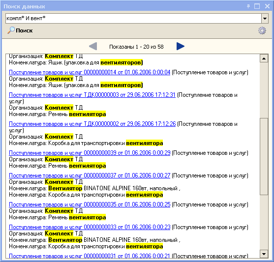 В представленном примере найдены документы, реквизиты которых содержат значения, начинающиеся на "Компл" и "вент" - контрагент "Комплетк ТД" и реквизиты, содержащие различные формы слова "вентилятор".