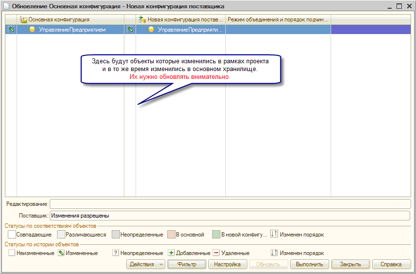4.6. Внесение наработок технического проекта в основное хранилище не должно проводить к длительному захвату объектов основного хранилища. Это достигается тем, что сначала хранилище технического проекта обновляется до состояния основного хранилища (по методике, описанной в приложении 2). Если изменений много, то такое обновление может занять достаточно много времени (до нескольких дней) – за это время конфигурация основного хранилища может измениться. Поэтому процесс обновления может быть итеративным – на каждой итерации обновления отличия в конфигурациях будут становиться все ближе к величине изменений, внесенных техническим проектом.
