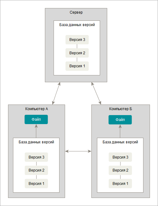 Следующая серьезная проблема, с которой сталкиваются люди, это необходимость взаимодействовать с другими разработчиками. Для ее решения были придуманы централизованные системы контроля версий (Centralized Version Control System). Примером такой системы является, например, хранилище конфигурации, которое использует платформа «1С:Предприятие», а также системы CVS, Subversion и Perforce. Они имеют один сервер, содержащий все версии файлов, и некоторое количество клиентов, которые извлекают файлы из этого центрального хранилища. Применение централизованных систем контроля версий являлось стандартом на протяжении многих лет.