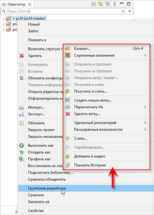 Например, в панели Навигатор команды Git находятся в контекстном меню проекта, в группе Групповая разработка.