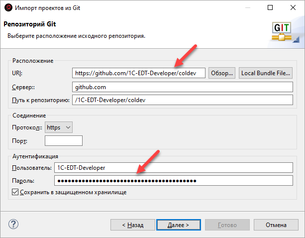 В поле URI укажите адрес репозитория, который вы хотите клонировать. Укажите пользователя и пароль для доступа к удаленному репозиторию. Установите флажок Сохранить в защищенном хранилище, чтобы 1C:EDT могла в дальнейшем автоматически использовать эти данные для аутентификации. Нажмите Далее.