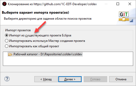 1C:EDT покажет вам проекты, находящиеся в удаленном репозитории. Отметьте их все, если их несколько, и нажмите Готово.