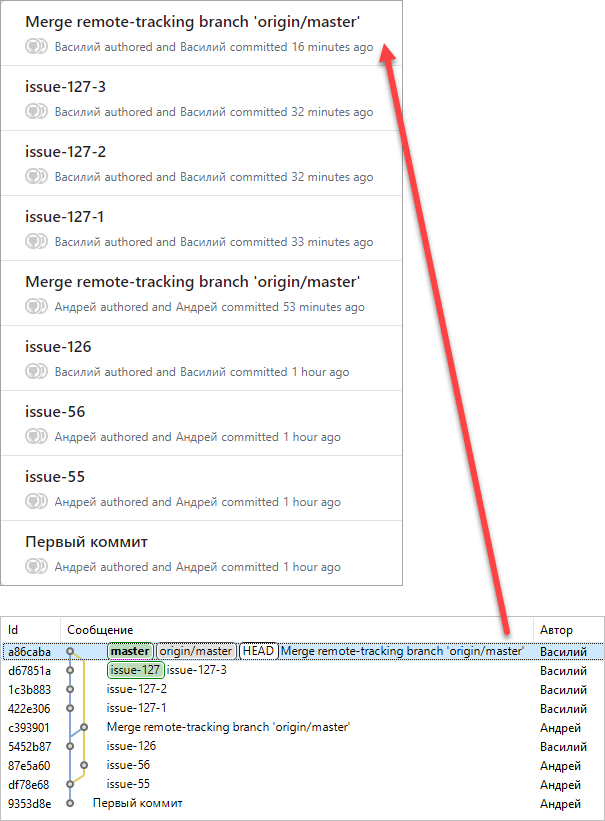 Он может влить сначала ветку origin/master, а может и issue-127 — обе они находятся выше в истории коммитов, так что не важно, какой порядок слияния он выберет. Конечное состояние репозитория должно получиться идентичным независимо от того, какой порядок слияния он выберет, только история коммитов будет немного разная.