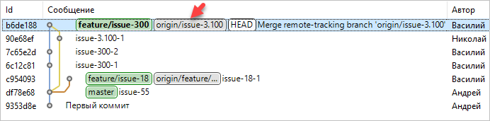 Обратите внимание, что, как Василий и хотел, его локальная ветка feature/issue-300 была отправлена на сервер в ветку issue-3.100. В результате его история коммитов имеет следующий вид.