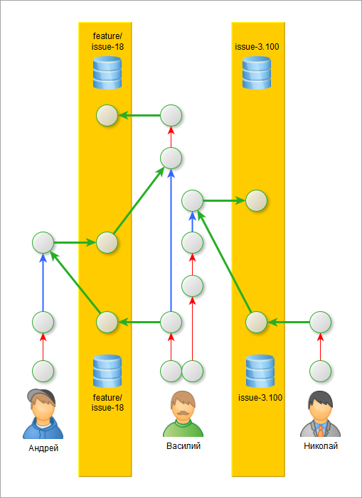 Представьте, что Андрей и Василий работают вместе над одной задачей (назовем ее feature/issue-18), в то время как Василий и третий разработчик, Николай, работают над другой (назовем ее feature/issue-300).
