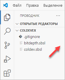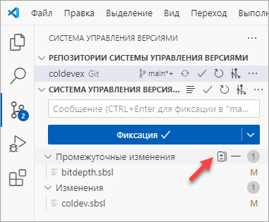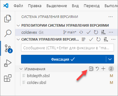 Допустим, вы изменили файлы bitdepth.sbsl и coldev.sbsl без индексирования. Если вы откроете представление Система управления версиями (Source Control), вы увидите что эти файлы изменены и они не включены в индекс.