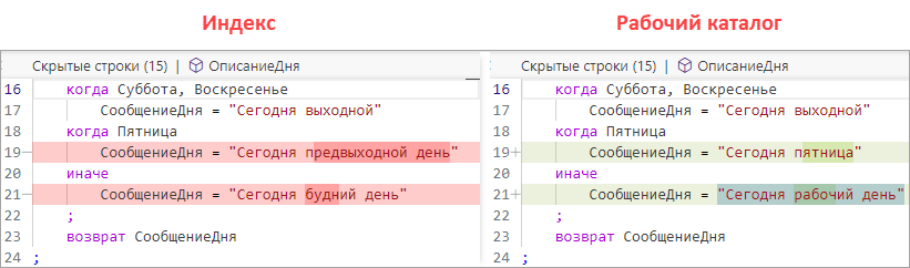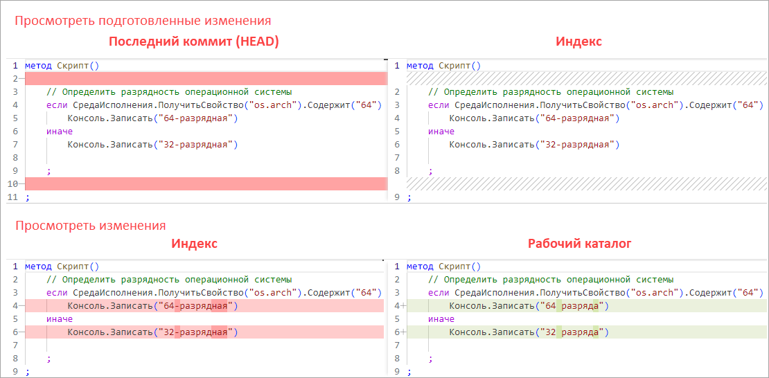 Вы видите, что изменены два файла. Для каждого из них показаны измененные строки. Слева находится индекс, справа — рабочий каталог.