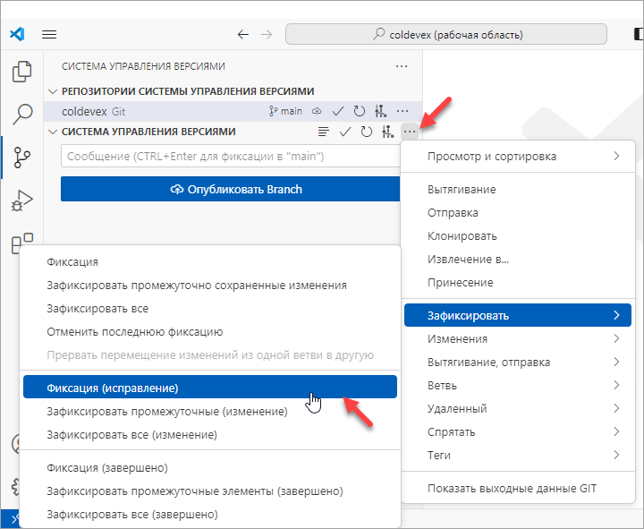 Если вы хотите изменить (дополнить) только комментарий к последнему коммиту, нажмите () в дополнительном меню раздела Система управления версиями (Source Control).